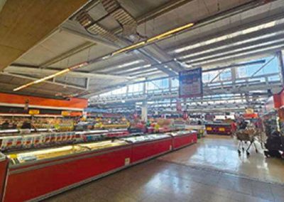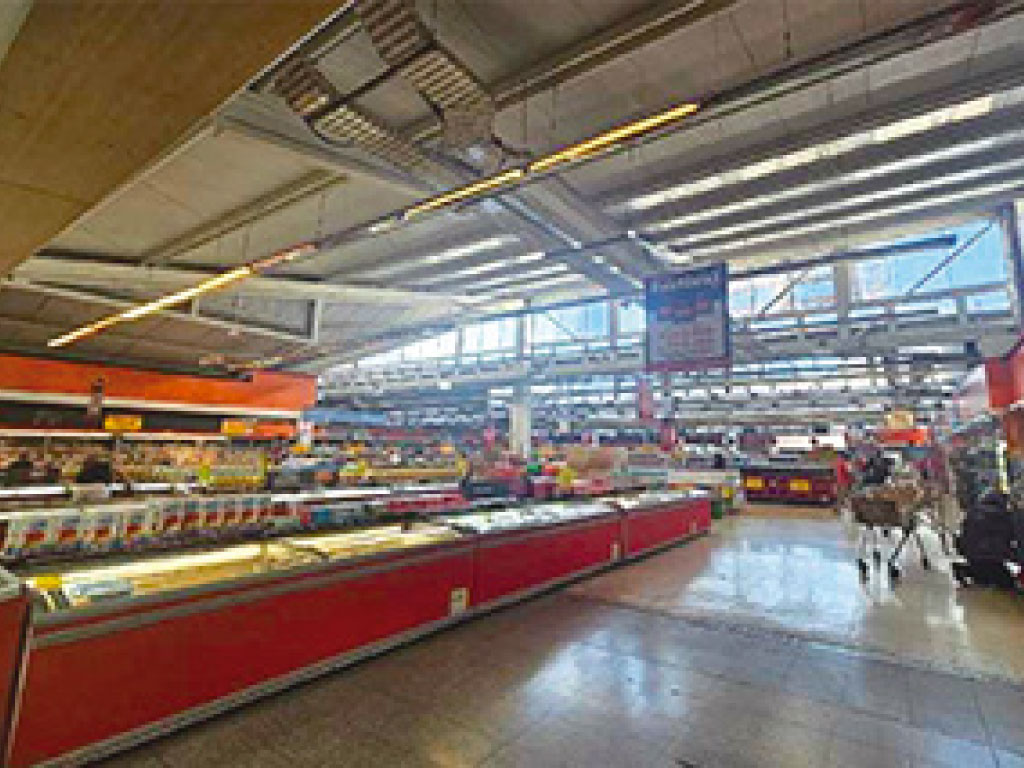 Cuenta en su primer piso con una amplia sala de supermercado de 4.100 m2, en la que hoy opera un Santa Isabel.